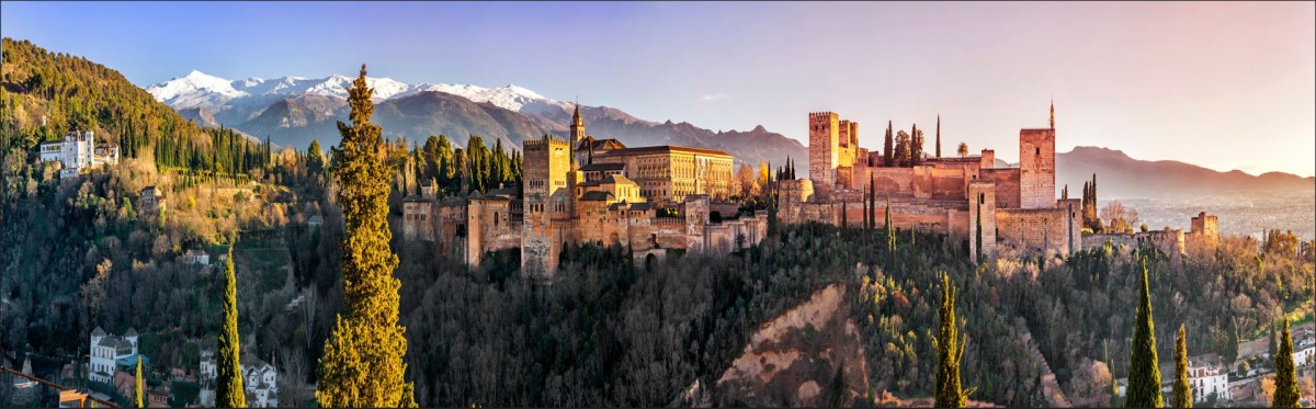 Majestically perched atop a hill, with commanding views over the surrounding countryside and the snowcapped mountain range of Sierra Nevada, the Alhambra (which means Red Castle in Arabic) was the seat of power of the Nasrid Dynasty and the Emirate of Granada from 1230 to 1492. The original fortress was built in the ninth century, over one thousand years ago. The palace served a dual role of projecting power (aggrandising its dynasty) and serving as their home. The castle’s rich crimson colour against the dramatic drop of a magnificent white mountain ridge behind it, which turns into dark purple at dusk, lends it an ethereal look, almost otherworldly.