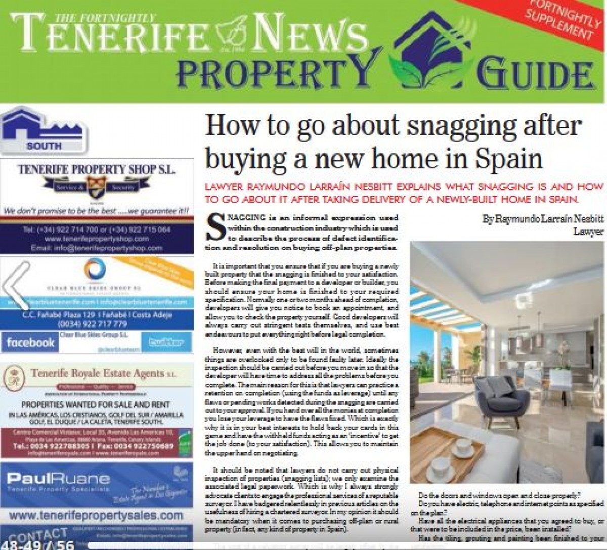 Tenerife News kindly published our article 'How to snag off-plan property'. Link to article (page 48): news clip.